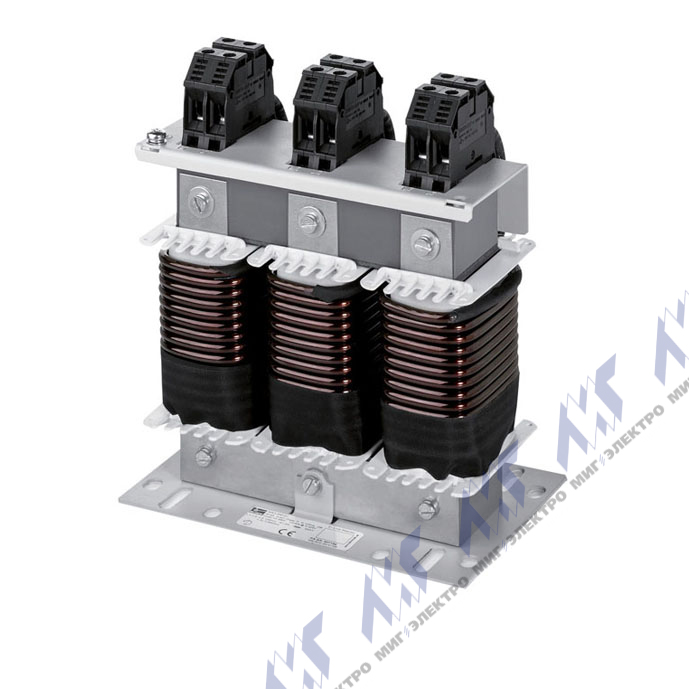 Трехфазный моторный дроссель MR3, защищает от скачков напряжения и перенапряжений du/dt, значительно увеличивает допустимую длину кабеля между двигателем и ПЧ, для частот коммутации от 3 до 8 кГц, номинальное напряжение 400 В, номинальный ток 24 A, номинальная частота от 0 до 50 Гц, IP00