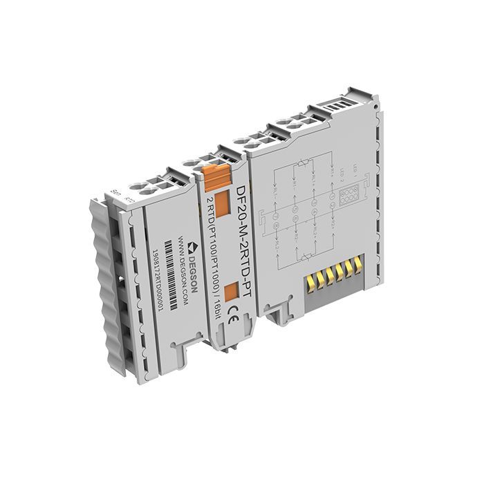 Модуль аналового ввода термосопротивления. 2 аналоговых входа термосопротивления (2 AI RTD), тип датчика PT100/PT1000, разрешение 16 бит. Производитель - Degson, серия DF20.