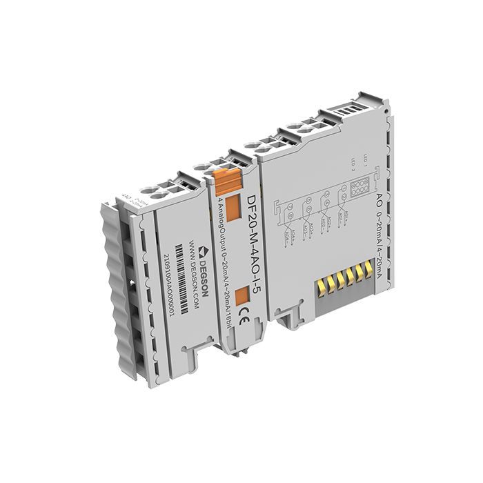 Модуль вывода аналоговых сигналов. 4 аналоговых выхода (4 AO), тип сигнала 0-20 мА/4-20мА, разрешение 16 бит. Производитель - Degson, серия DF20.