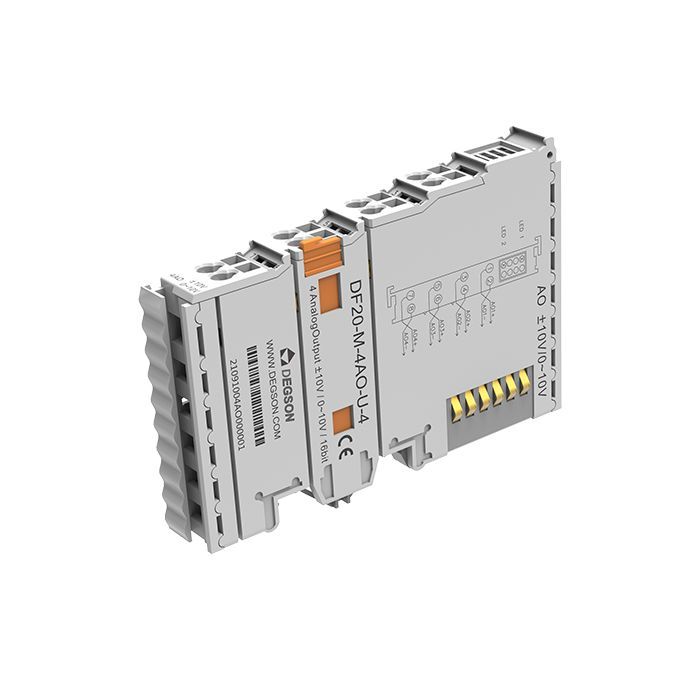 Модуль вывода аналоговых сигналов. 4 аналоговых выхода (4 AO), тип сигнала ±10В/0-10В, разрешение 16 бит. Производитель - Degson, серия DF20.