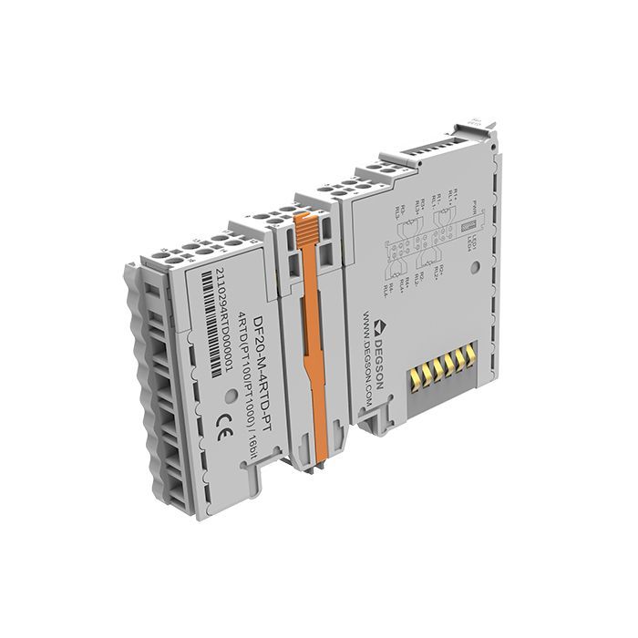 Модуль аналогового ввода термосопротивления. 4 аналоговых входа (4 AI RTD), тип датчика PT100/PT1000, разрешение 16 бит. Производитель - Degson, серия DF20.