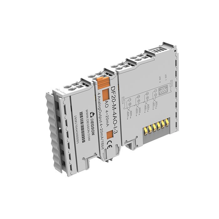 Модуль вывода аналоговых сигналов. 4 аналоговых выхода (4 AO), тип сигнала 0-20 мА, разрешение 16 бит. Производитель - Degson, серия DF20.
