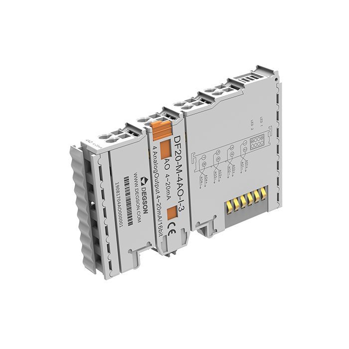 Модуль вывода аналоговых сигналов. 4 аналоговых выхода (4 AO), тип сигнала 4-20 мА, разрешение 16 бит. Производитель - Degson, серия DF20.