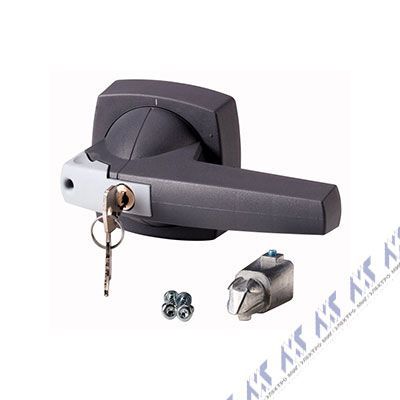 Рукоять D-типа с цилиндрическим замком, монтаж на дверь, под ось 10х10, серая