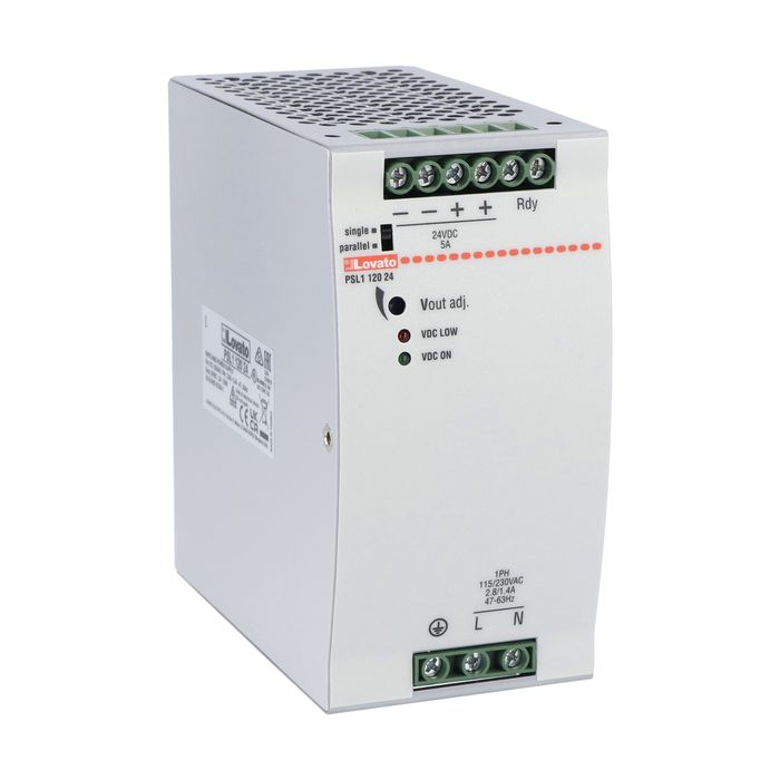 Стабилизированный импульсный источник питания, промышленное исполнение. Однофазный, входное напряжение 230В (AC), выходное напряжение 24В (DC), 5 А, 120 Вт. Производитель - Lovato Electric, серия PSL