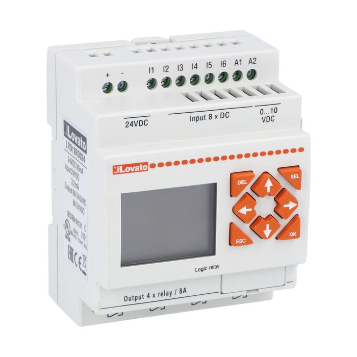 Базовый логический модуль (микроконтроллер). Напряжение питания 24В (DC), 8 входов (6DI+2DI/AI) , 4выхода (4DI, релейные). Производитель - Lovato Electric, серия LRD