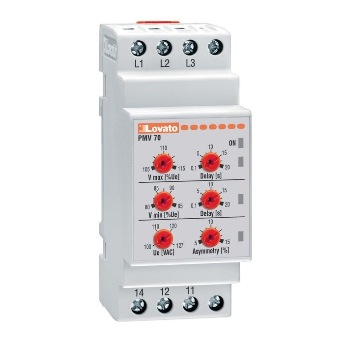 Реле контроля напряжения в трехфазной сети. Без контроля нейтрали. Минимальное и максимальное напряжение, обрыв фазы, неверная последовательность, асимметрия фаз. Напряжение - 380...575В (AC). Производитель - Lovato Electric, серия PMV70