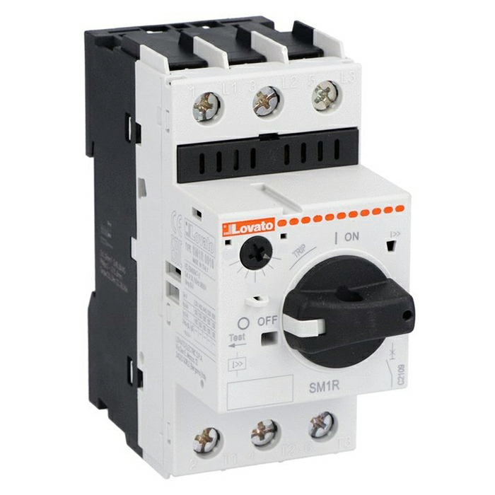 Автоматический выключатель защиты двигателя SM1R 0,4А, 3 полюса, откл. способность 100кА, диапазон уставки 0,25-0,4А. Управление - поворотная рукоятка. Производитель - Lovato Electric. Серия - SM1