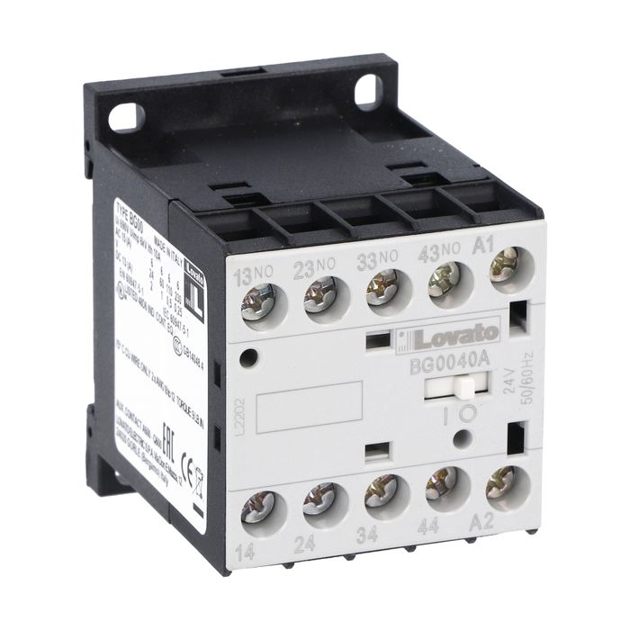 Вспомогательный контактор (реле), категория применения AC-15, управляющее напряжение 24В (АС; 50/60 Гц), контакты 4НО, контактные зажимы - винтовые. Производитель - Lovato Electric, серия BG.