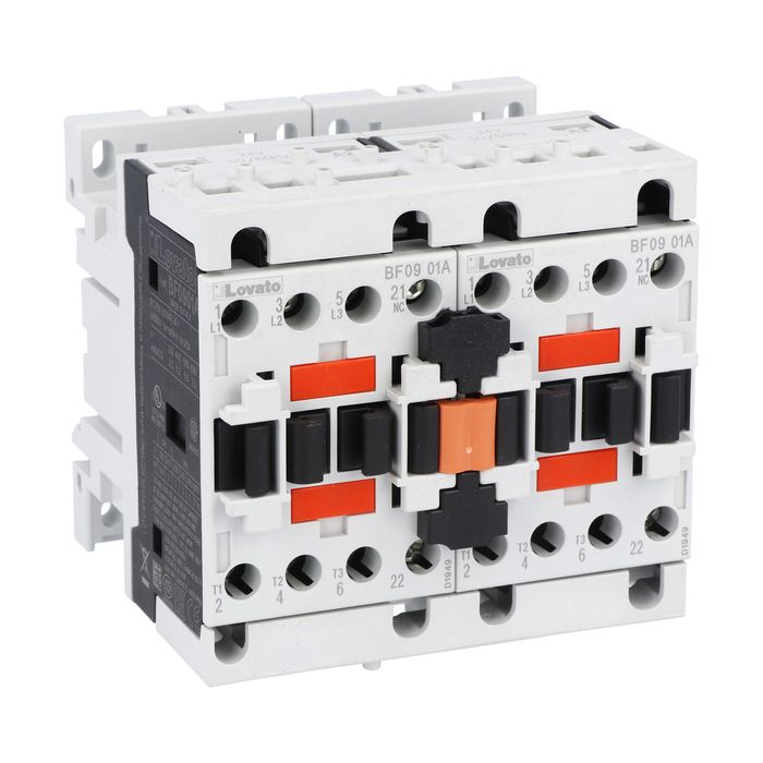 Реверсивный трехполюсный контактор для управления двигателем, индуктивными нагрузками (AC-3), 9А/4,2кВт (400В), управляющее напряжение 24В (АС; 50/60 Гц), категория применения АС-3. Контактные зажимы - винтовые. Производитель - Lovato Electric, серия BF.